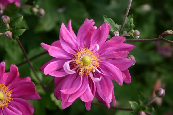 Anemone japonica ‚Bressingham Glow‘ Diese Anemonen sind treue Begleiter unserer Gartenkultur – es gibt Sorten, die seit über 150 Jahren im Handel sind. Und es sind immer noch wunderbare Sorten, die auch von Neuzüchtungen nicht verdrängt werden konnten. Die Pflanzen bilden dichte Bestände mit einem reichen Blütenflor, der vom Sommer bis in den Herbst reicht. Im lichten Schatten bis hin zu sonnigen, aber nicht zu trockenen und heißen Lagen fühlen sie sich wohl und überdauern viele Jahre. Keine großen Düngergaben – sonst kann die Winterhärte der Pflanzen leiden. Bei einer Herbstpflanzung sollte im November über die Pflanze eine kleine Laubdecke geschüttet werden, das hilft der Pflanze beim Anwachsen. Da die Blüte aller Sorten sehr reich ist können Sie ruhig ein paar Schnittblumen herausnehmen, dazu eignet sich die Pflanze ebenfalls gut.