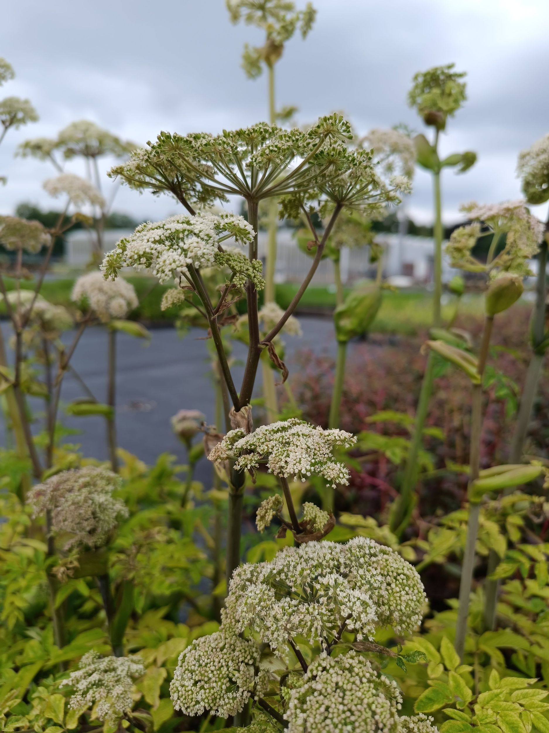 weiß, VII-IX, 130 cm, Blatt grün, halbschattig, mittel bis feucht, horstig, Pflanzabstand 100 cm