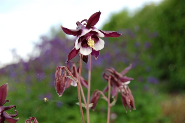 Aquilegia William Guiness besticht durch die einfache Blüte, die mit ihrem dunklen, fast schwarzen Violett, unterstützt durch kontrastierende weiße Blütenblätter, eine besondere Blütenfarbe mitbringt.