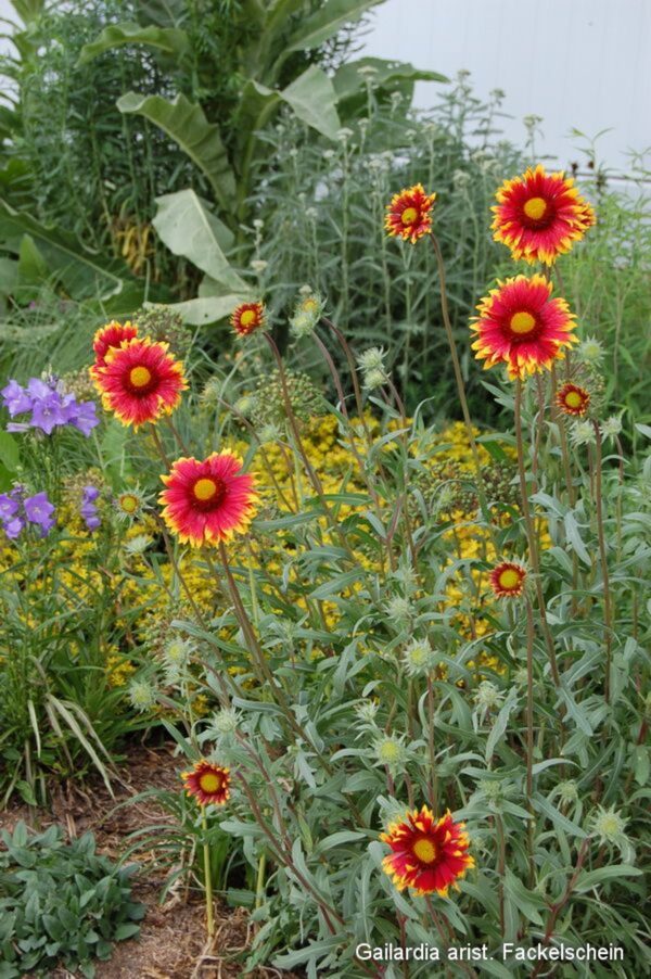 In dieser Mischung verweben sich bodendeckende Stauden, wie Zypressen-Wolfsmilch, Garten-Dost, Braunelle und Fetthenne zu einem bodendeckenden Teppich. Daraus erheben sich die filigranen Blütenstände der Gerüst- und Gruppenstauden in unterschiedlichen Farben und Formen, was die vielfältige und bunte Pflanzung fröhlich und leicht wirken lässt. Die kurzlebige Verbene erhält sich durch Selbstaussaat und verleiht der Pflanzung eine natürliche Wirkung. Die Pflanzung ist durch ihre Vielfalt an Fruchtständen bzw. im Winter sichtbaren Strukturen auch in der blütenlosen Zeit äußerst attraktiv und bietet Vögeln im Winter Nahrung und Insekten Unterschlupf. Frühblühende Zwiebeln sorgen bereits ab Februar für Farbe im Beet, somit liegt zwischen Rückschnitt und Neuaustrieb bzw. Blühbeginn nur eine kurze Zeitspanne.