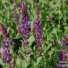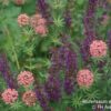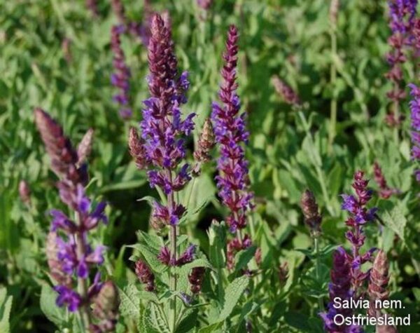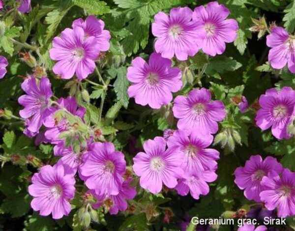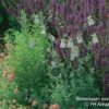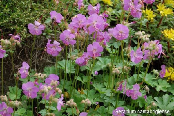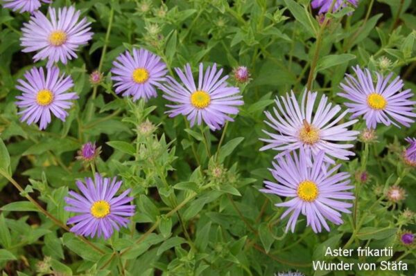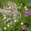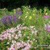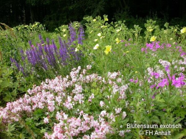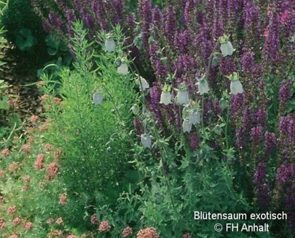 Dichte Bodendecker bilden das Grundgerüst dieser Pflanzung, die Blüte ist gleichmäßig über das Jahr verteilt. Die weißen und blauen Frühlingsveilchen schließen an die Farbe der weißen und blauen Blausternchen an, Wildtulpen unterstreichen den exotischen Charakter bereits im Frühjahr. Der bekannte Ziersalbei wird mit den eher seltenen Tigerglocken kombiniert. Auch der Rosenwaldmeister ist eine nicht alltägliche Staude, dabei sehr robust und verbreitet sich gut. Wegen seines intensiven Geruchs sollte er nicht genau vor dem Schlafzimmerfenster stehen – ist aber im Garten in keiner Weise störend! Auch Aster frikartii ‚Mönch’ ist selten im Sortiment vertreten, dabei eine sehr dankbare Sommeraster. Geranium gracile ‚Sirak’ ist vielen unbekannt, die pinkfarbenen Blüten mit der intensiven Aderung unterstreichen den exotischen Charakter der Pflanzung.