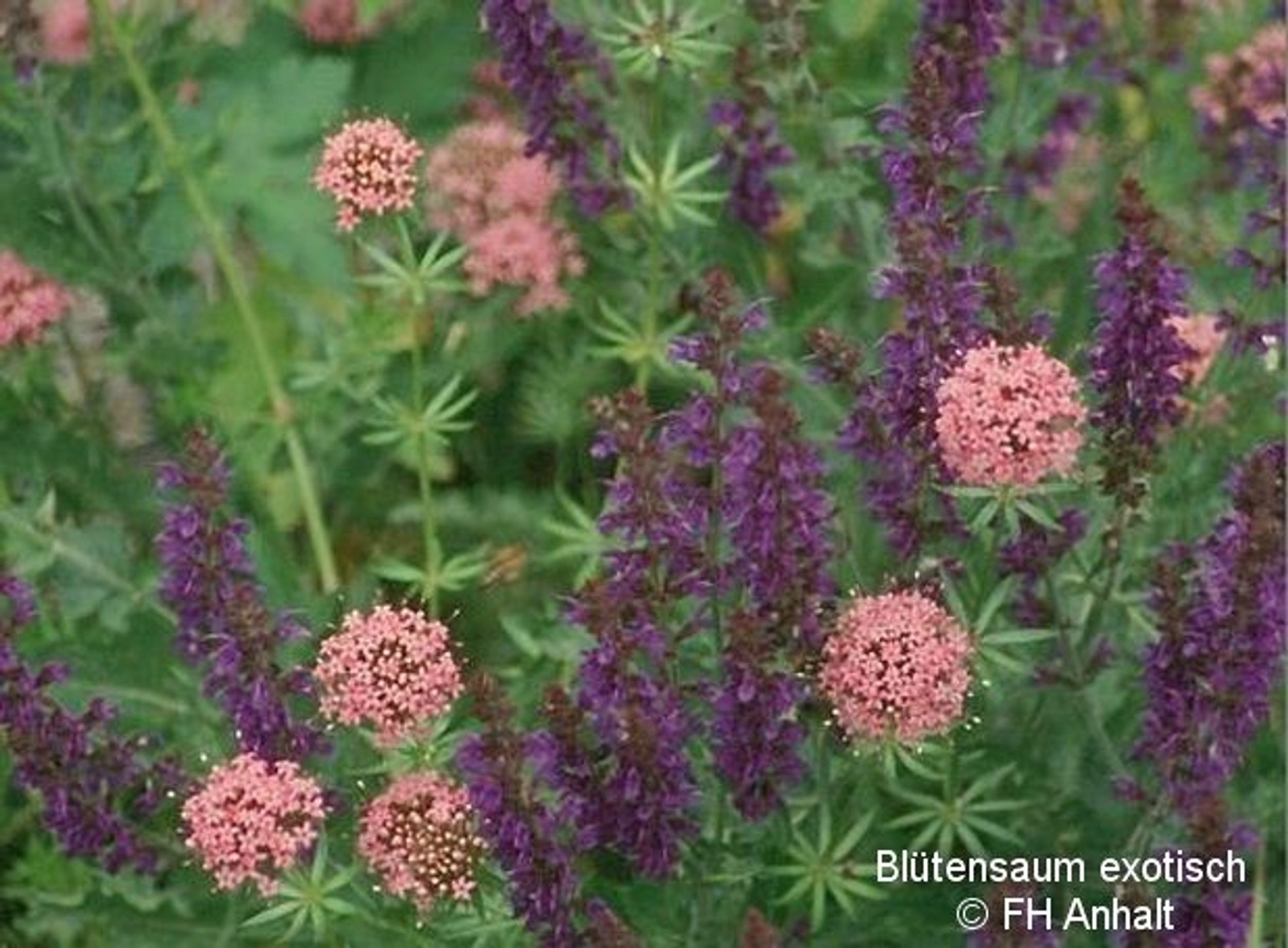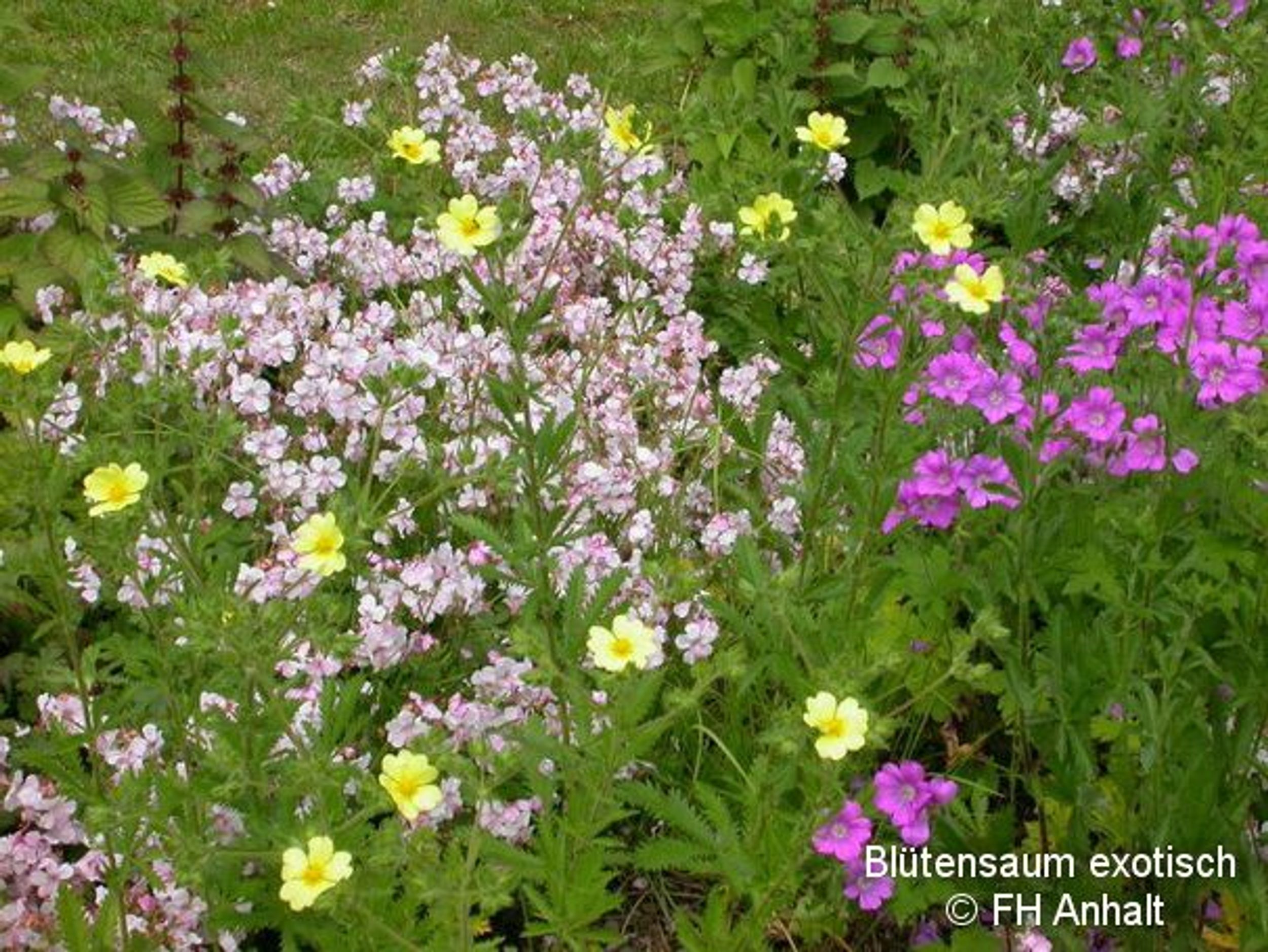 Dichte Bodendecker bilden das Grundgerüst dieser Pflanzung, die Blüte ist gleichmäßig über das Jahr verteilt. Die weißen und blauen Frühlingsveilchen schließen an die Farbe der weißen und blauen Blausternchen an, Wildtulpen unterstreichen den exotischen Charakter bereits im Frühjahr. Der bekannte Ziersalbei wird mit den eher seltenen Tigerglocken kombiniert. Auch der Rosenwaldmeister ist eine nicht alltägliche Staude, dabei sehr robust und verbreitet sich gut. Wegen seines intensiven Geruchs sollte er nicht genau vor dem Schlafzimmerfenster stehen – ist aber im Garten in keiner Weise störend! Auch Aster frikartii ‚Mönch’ ist selten im Sortiment vertreten, dabei eine sehr dankbare Sommeraster. Geranium gracile ‚Sirak’ ist vielen unbekannt, die pinkfarbenen Blüten mit der intensiven Aderung unterstreichen den exotischen Charakter der Pflanzung.