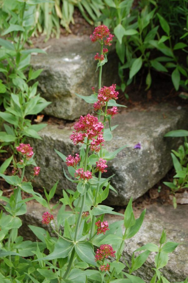 Centranthus ruber Coccineus hat hübsche rosarote Blüten mit sattgrünen Laub. Robuste Art; die immer wieder überraschend an andren Stellen im Garten auftaucht ohne jemals lästig zu werden.