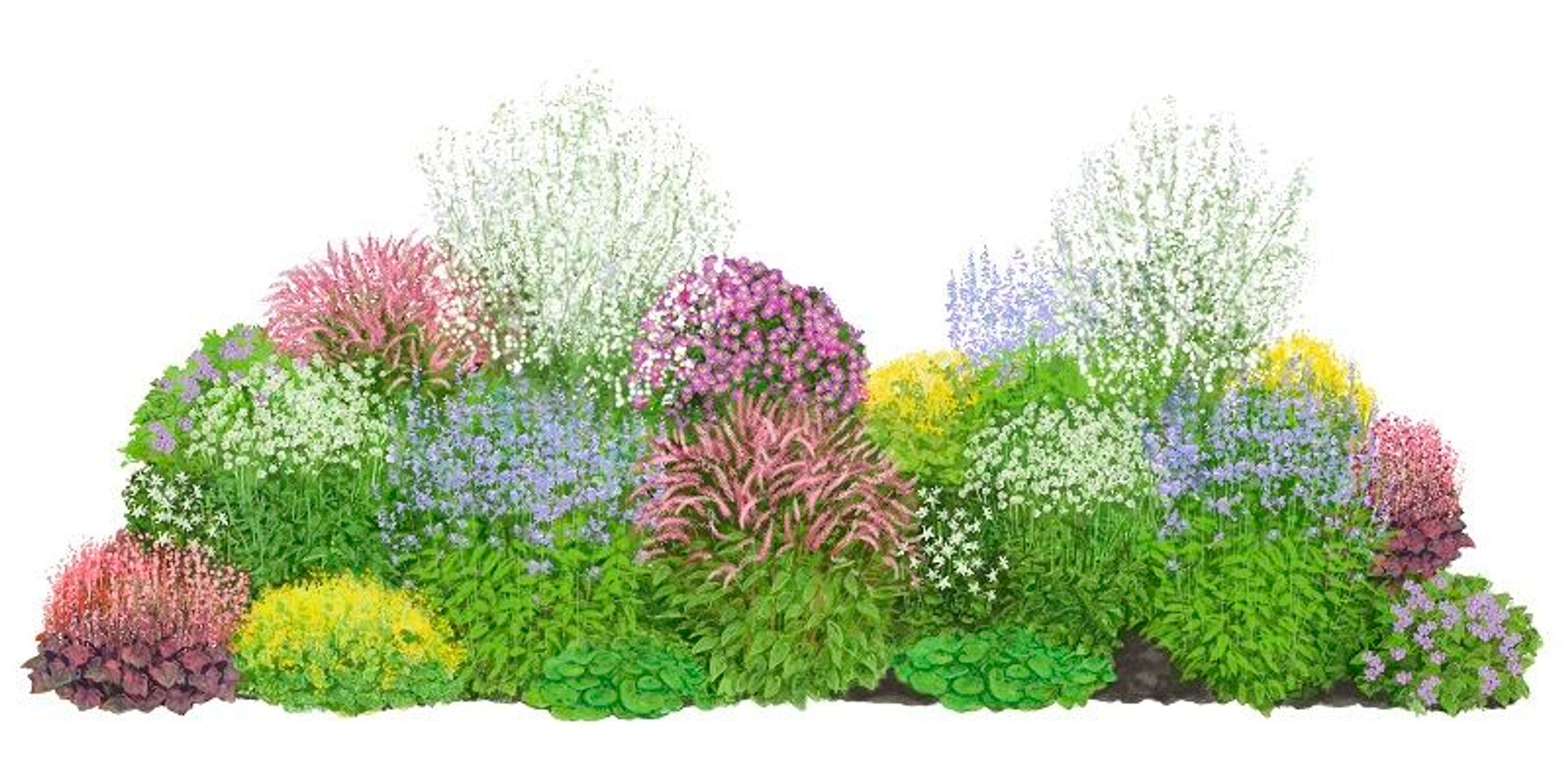 Unser Kraut und Rüben Cottagegarten für den Halbschatten kombiniert sanfte Farben aus dem weiß-lila-gelblichen Spektrum. Über einem sanften Blütenflor aus Sterndolden, Katzenminze und Purpurglöckchen stehen die filigranen Blütenstände der Wiesenraute und des Wiesenknöterichs. Bodendecker wie Storchschnabel und Frauenmantel runden das harmonische Bild ab und sorgen für wenig Unkrautbewuchs. Als Highlight im Herbst blüht die Aster im strahlenden Pink und bietet den Insekten noch bis Anfang des Winters Nahrung.