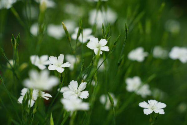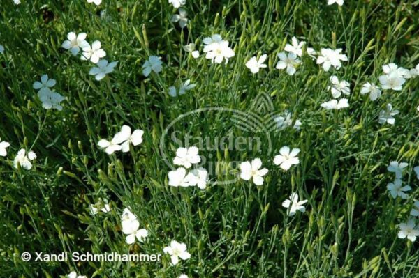 Dianthus deltoides ‚Albus‘ Heidenelken bilden ein sattgrünes dichtes Polster, das zur Blütezeit von kleinen, strahlenden Blüten bedeckt wird. Diese Selektion blüht reinweiß, das mittelgrüne dichte Laubpolster wird zur Blütezeit fast vollständig von den zahlreichen kleinen Blüten bedeckt.