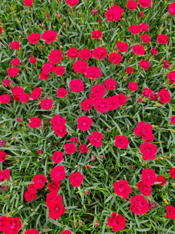 Dianthus Rubin macht zahlreiche Blüten in sattem Rot. Die Blüten stehen auf kurzen Stielen dicht über dem Laub. Sehr robustes Laubpolster.