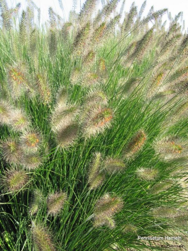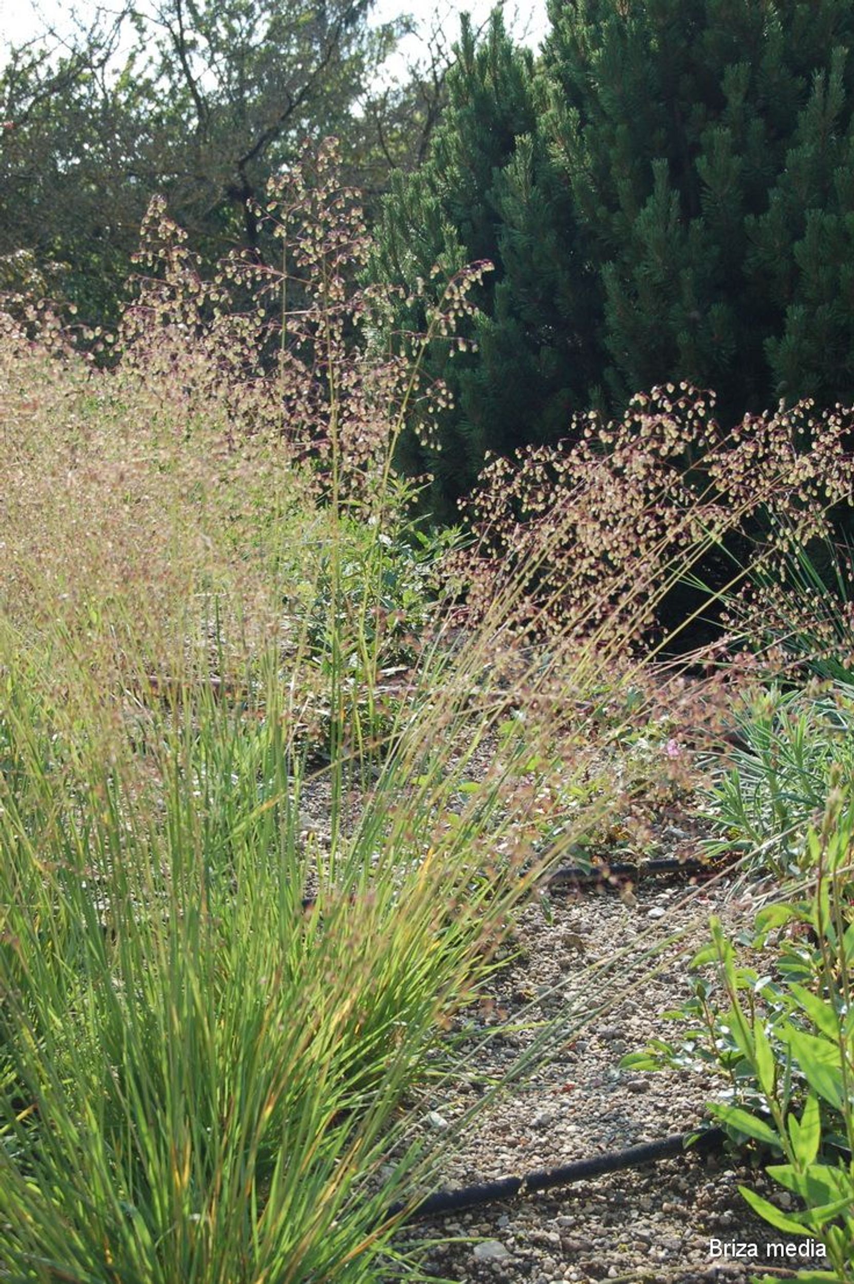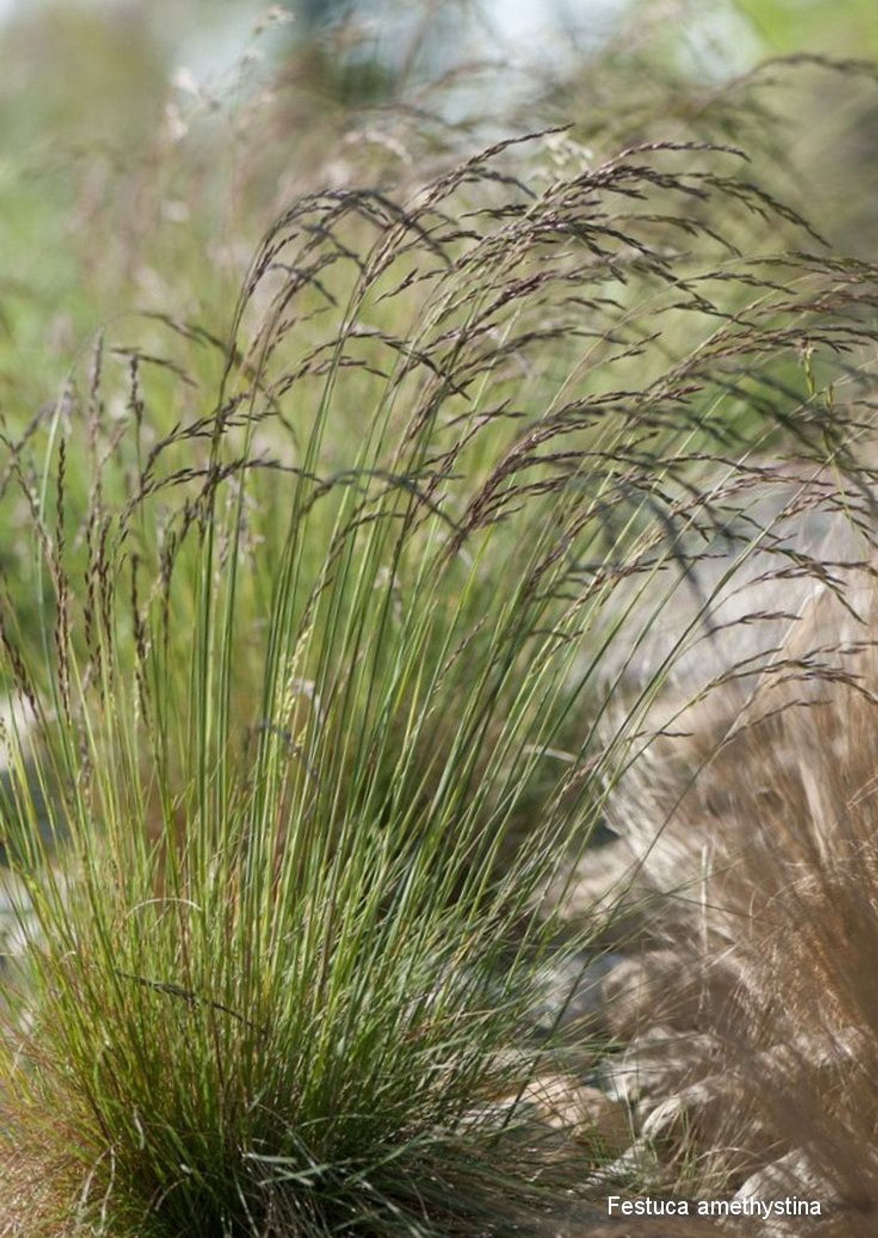 Gräser bringen ein ganz besonderes Element in den Garten. Bei dieser Mischung sind die Bodendecker robust, aber doch mit einer feinen Blüte am Ende des Frühjahrs bis zum Frühsommer. Zuvor bringen die zwei Wildtulpen eher ungewöhnliche Farben in den Garten. Das Silber-Ährengras hat eine sehr schöne, leichte Wirkung. Dagegen tritt die Morgensternsegge mit kräftigem Laub und besonderen Fruchtkörpern auf. Plattährengras und Pfeifengräser haben sehr unterschiedliche, aber ausdrucksstarke Blüten, die gefolgt werden von der Blütenwolke des Präriegrases – eines der wenigen Gräser, das duftet. Das Chinaschilf ist eine kräftige Gestalt, es sollte also eher prominent, nicht am Rande des Beetes verwendet werden. Ein paar Blütentupfer müssen sein: Der Storchschnabel unterlegt das Beet mit einem lang blühenden Blütenteppich. Die Prachtkerze kommt in ihrer grazilen Wirkung den Gräsern nahe, während die Blüten des Eisenkrautes über der Pflanzung des Beetes zu schweben scheinen.