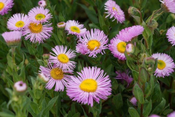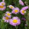 Erigeron ‚Rosa Juwel‘ blüht mit einfachen bis halbgefüllten Blüten in einem reinen, hellen Rosa. Eher kleine Blüten auf gut verzweigten Blütenstielen.