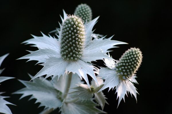 Ein richtiger Trockenkünstler und je wärmer und sonniger der Standort ist, um so markanter färben sich diese Stauden aus. Das vielgestaltige Laub ist im Frühjahr grün, färbt sich dann im Lauf des Sommers graugrün bis silbrig, die Blütenstängel sind hart und stabil, tragen markante Blütenköpfchen, die ein Kranz von Kelchblättern umgibt. Silbergrau sind diese Blüten zunächst, färben sich dann in ein Silbrig bis Blau aus. Sandige, steinige aber auch eher trockene Lehmböden sind gut geeignet, Dünger mögen diese Pflanzen eher nicht, dadurch leidet die Winterhärte und die Pflanzen färben sich nicht so gut aus. Die Pflanze ist ein Paradies für Schmetterlinge und andere Insekten.