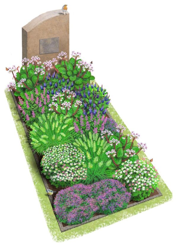Dieses Paket vereint langblühende und bekannte Stauden, um den Wiedererkennungswert zu stärken. Steppensalbei und Lampenputzergras gestalten mit einem flachen Thymian und dem unermüdlich blühenden spanischen Gänseblümchen eine Kombination, die sich mit Bergenie sehen lassen kann. Diese und das Gras strukturieren das Grab auch im Winter und geben Platz für ein Gesteck oder eine temporäre Vase. Als besondere Staude findet sich hier die Frühlingsplatterbse. Sie ist eine farbenreiche Frühjahrsstaude, die noch dazu heimisch ist.