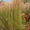 Es muss nicht immer massiv und undurchdringlich sein – machen Sie Ihre Terrasse oder die Grenze Ihres Gartens zu einem eleganten Schmuckstück. Das Gerüst bildet das Reitgras. Dessen hohe Stängel erscheinen bereits im Juni in frischgrüner Farbe, färben sich im Sommer gelb und bleiben den ganzen Winter aufrecht in einem dunkler werdenden Braunton erhalten. Das Silberährengras macht seinem Namen alle Ehre, die silbrigen Ähren sind leicht überhängend als Gegensatz zum Reitgras. In fast kugeliger Form erscheint das Lampenputzergras, dessen stabile, walzenförmigen Blütenstände mit weißen Spitzen einen ganz eigenen Charakter haben. Dazwischen greift die Neuseeland-Segge ‚Prairie Fire‘ den orange-braunen Grundton der Pflanzung auf. Als zusätzlicher Farbklecks mischt sich in eigenwilliger kräftig roter Farbe das japanische Blutgras dazwischen.