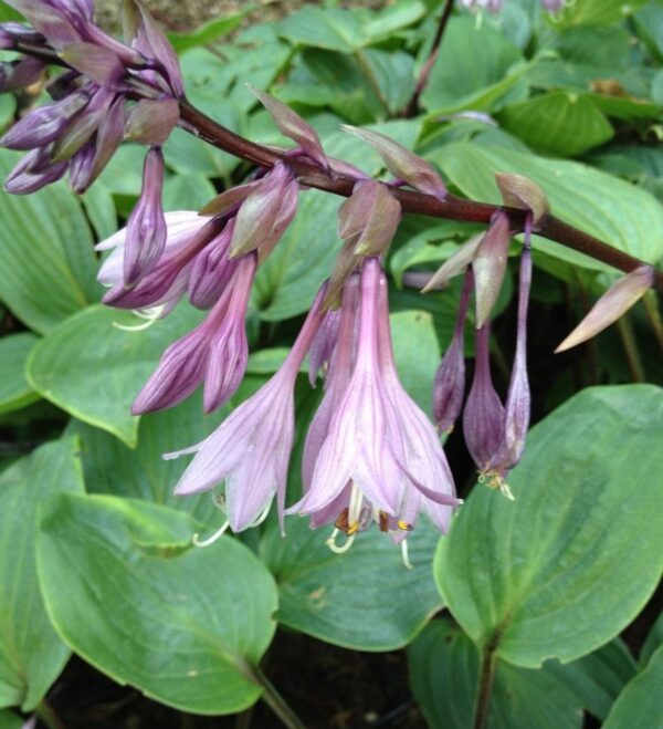 Hosta ‚Purple Heart‘ hat frischgrünes Laub, die burgunderrote Färbung am Blattgrund und an den Blatt- und Blütenstängeln gab ihr den Namen. Sie wächst kompakt und besitzt hängende, trichterförmige Blüten an burgunderfarbenen Stielen. Die Blütenfarbe hellt sich vom Blütenkelch zu den Blütenspitzen hin auf.