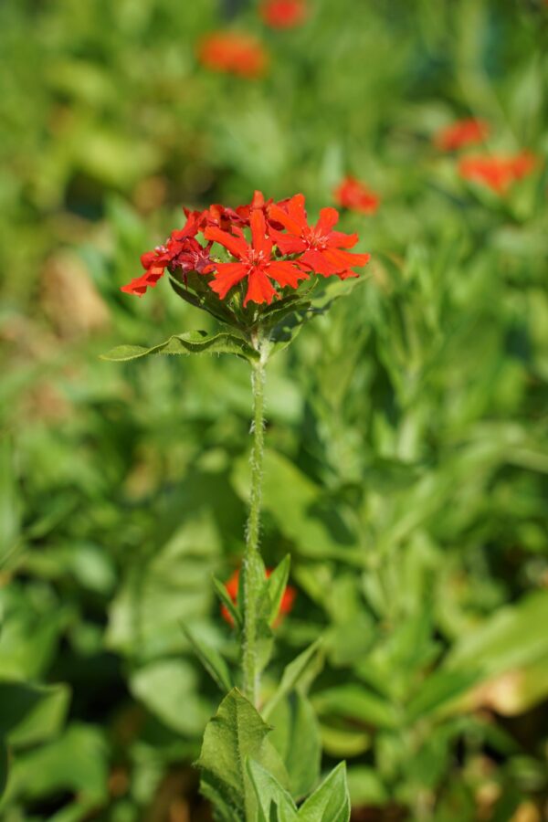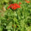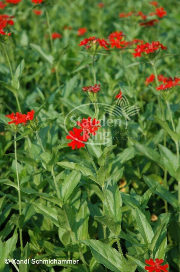 Die Brennende Liebe macht ihrem Namen im sonnigen Staudenbeet alle Ehre. Mit ihren scharlachroten Blütendolden trumpft die Blühstaude im Sommer auf. Unter dem Namen Scharlach-Lichtnelke wurde sie bereits im 16. Jahrhundert in unsere Gärten eingeführt. Auf hohen, schlanken, aber stabilen Stängeln leuchten die Doldenblüten. Das frischgrüne Laub ist vollkommen gesund, die Pflanze absolut winterhart. Die Pflanze wächst in der Sonne, kann aber auch in den lichten Schatten gepflanzt werden. Der Boden sollte humos bis lehmig und nicht zu trocken sein – also eine optimale Pflanze für die Staudenrabatte. Dabei ist sie aber pflegeleicht und frei von Schädlingen und Krankheiten, nach der Blüte am besten die ganze Pflanze auf 5 cm zurückschneiden – dann bildet sich schnell wieder gesundes neues Laub.