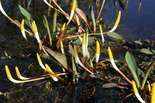 gelb, V-VI, 30 cm, Blatt grün, blass-blau, sonnig, Wasserpflanze, horstig, Pflanzabstand 45 cm