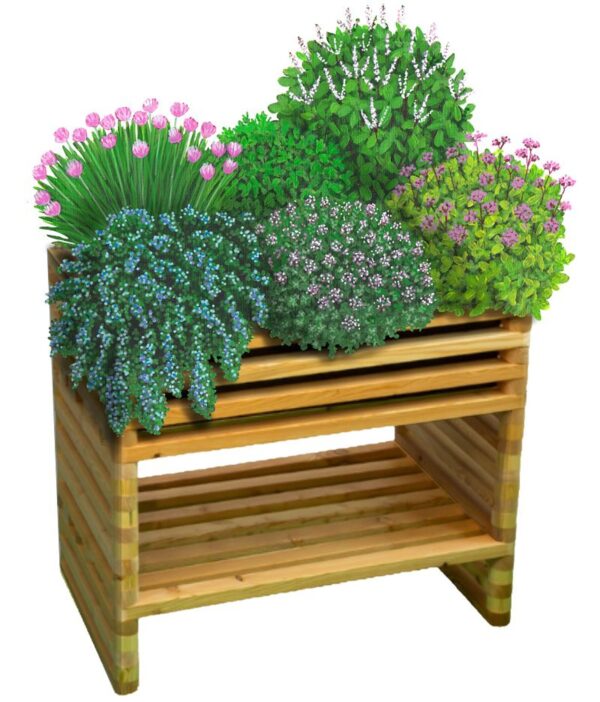 Hochbeet Sissi Kräuter – die kleine Alternative zum Hochbeet Maximilian Kräuter. Passt auch auf kleine Terrassen oder den Balkon und bietet mit dem integrierten Stauraum Platz für Ihre Gartenutensilien. Unsere mehrjährigen, winterharten Kräuter liefern Ihnen zuverlässlich frische Kräuter – und das über viele Jahre hinweg. Die ökologische und optisch hochwertige Alternative zu den „Wegwerfkräutern“ aus dem Supermarkt.