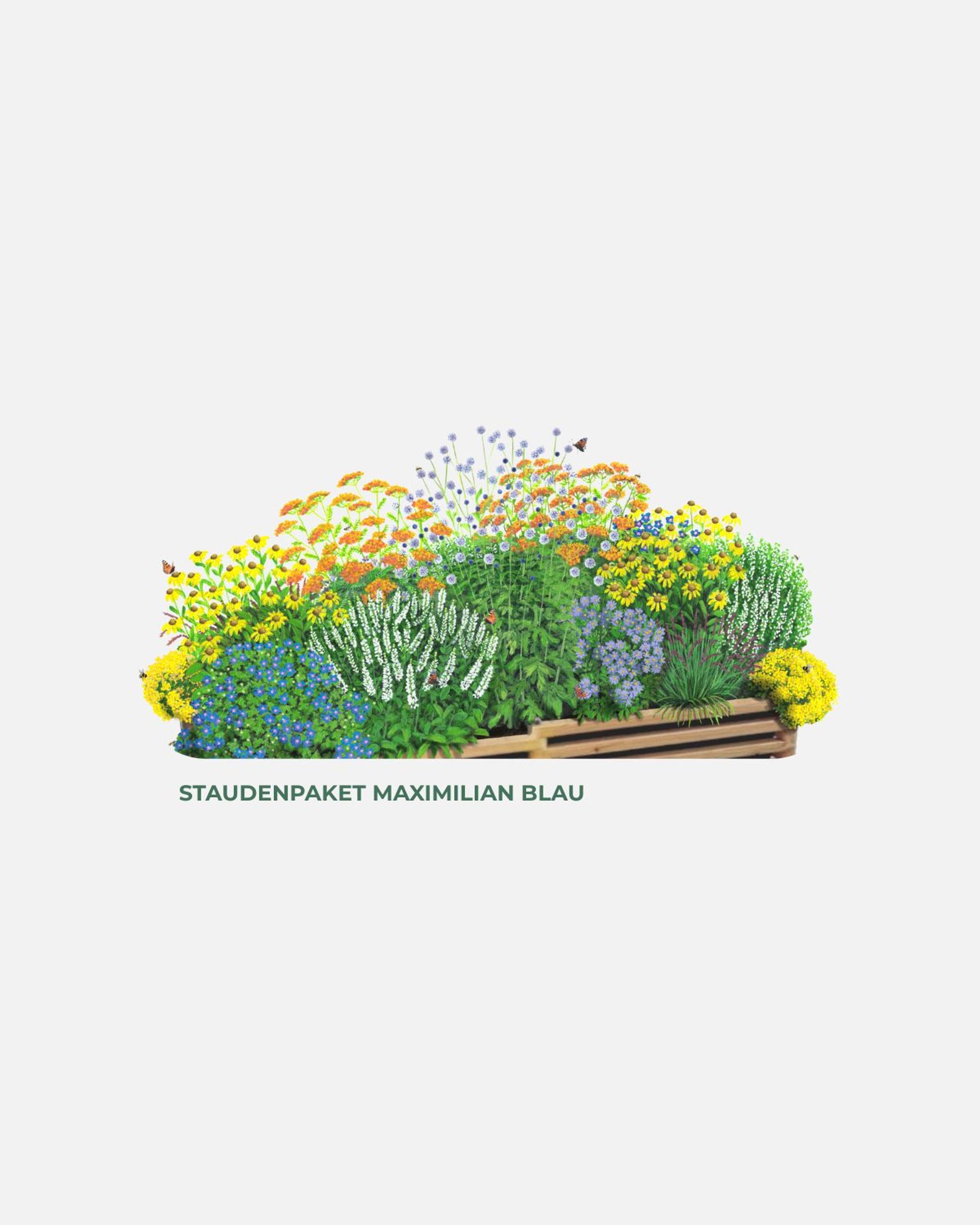 Dieses winterharte Staudenpaket in blau-gelb Tönen blüht von April bis Oktober und liefert so für viele Monate Nahrung für alle Insekten. Die ausgesuchten Stauden bieten zudem einen Blickfang in Ihrem Hochbeet. Alternativ zum Hochbeet „Maximilian“ können sie diese Kombination natürlich auch im Gartenbeet pflanzen – eine Fläche von ca. 2m² ist hierfür ideal. Und das Beste: Sie können jederzeit einen hübschen Blumenstrauß für die Vase schneiden!