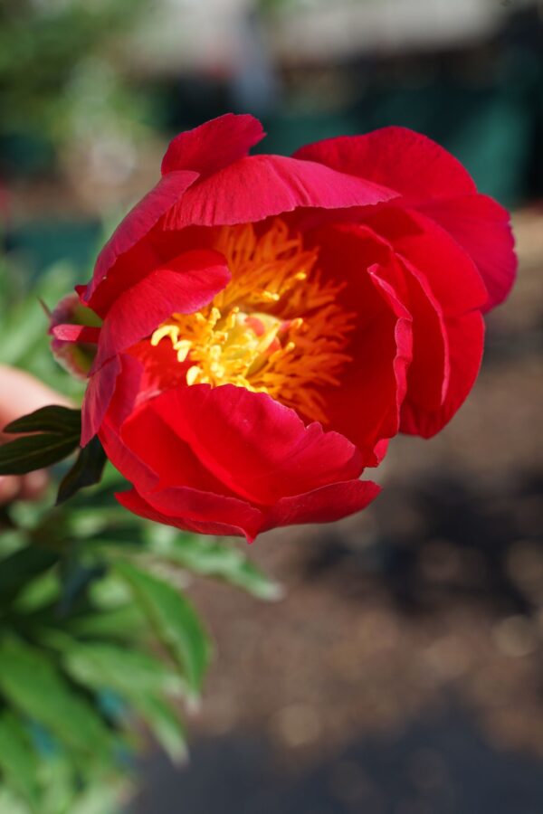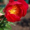 Paeonia lactiflora ‚Flame‘ Einfach leuchtend rote Blüten mit zarten gelben Staubfäden. Zahlreiche Blütenstängel die wenig verzweigt sind.