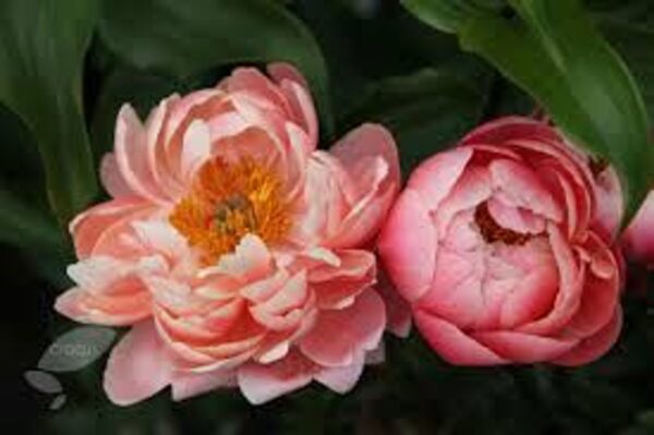 Paeonia Hybr. ‚Coral Charm‘ Halbgefüllte Blüten in einer ganz besonderen Farbe zwischen Rosa und Lachsfarben, die Blüte wird gegen Ende der Blütezeit heller. Dunkles Laub. Wüchsig und robust
