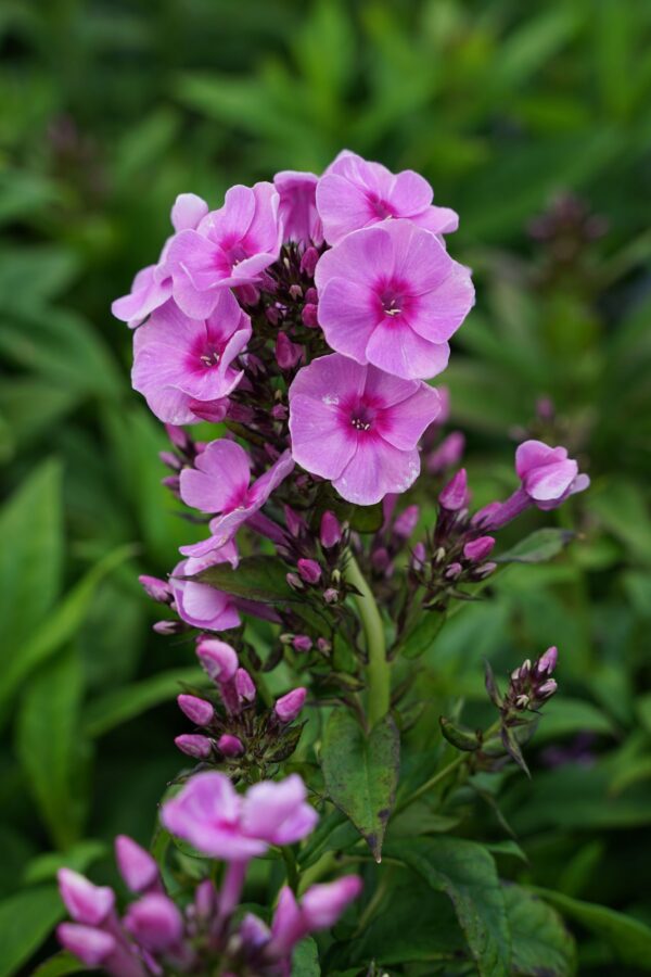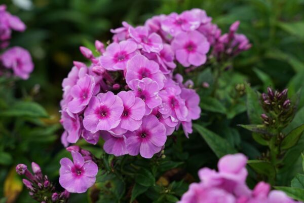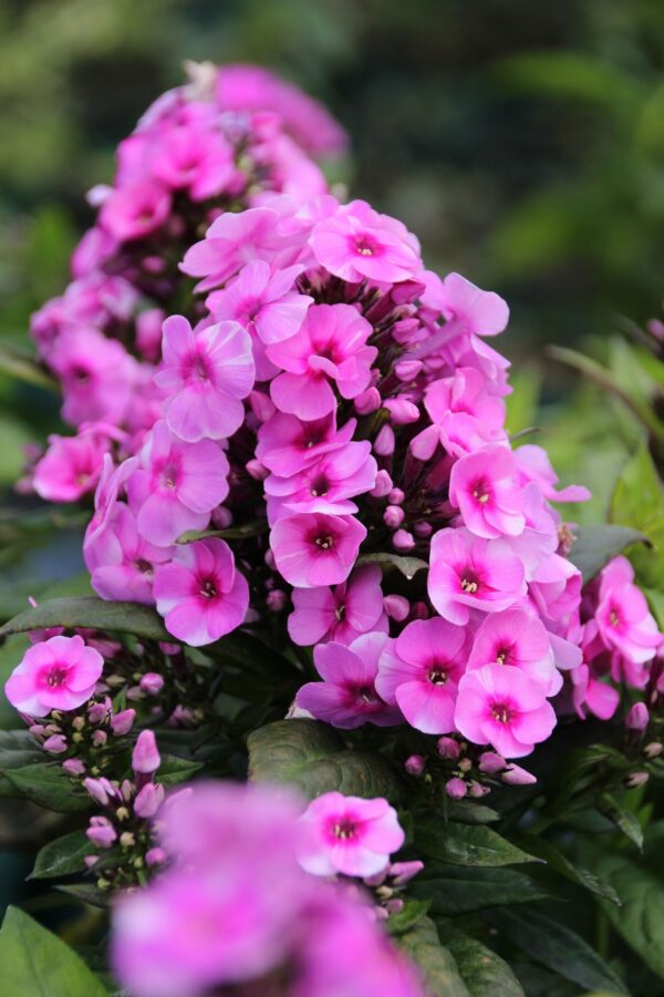 Phlox ‚Fondant Fancy‘ ist eine neuere Züchtung. Die rosavioletten Blüten mit dem dunklen Auge sind nicht zu groß, farbintensiv, sehr stabil und regenfest. Kompakter Wuchs, nur ca. 40-60 cm hoch und damit gerade für kleinere Beete sehr gut geeignet. Den typischen Phloxduft bringt auch diese Pflanze mit. Sehr gesund und wenig krankheitsanfällig.