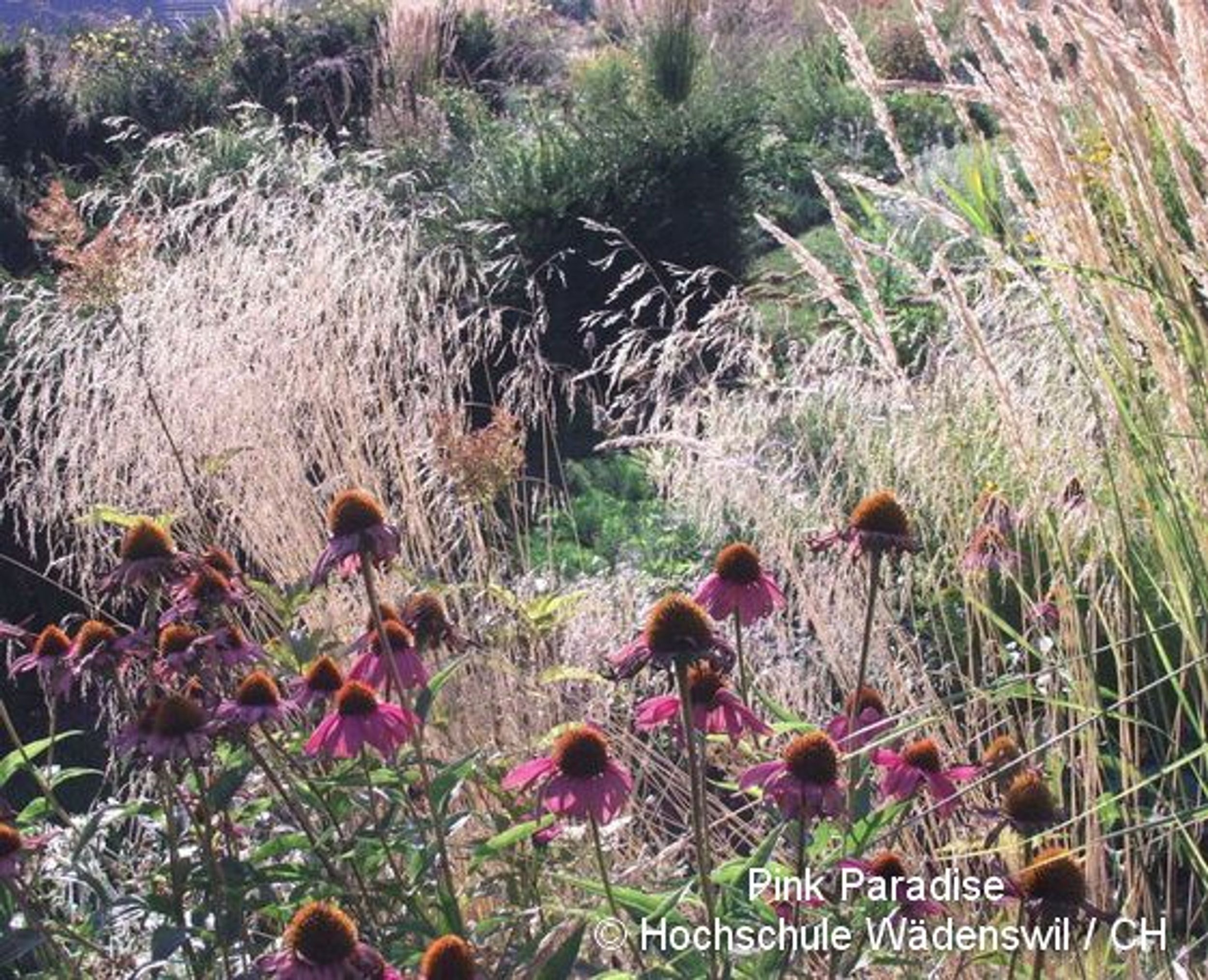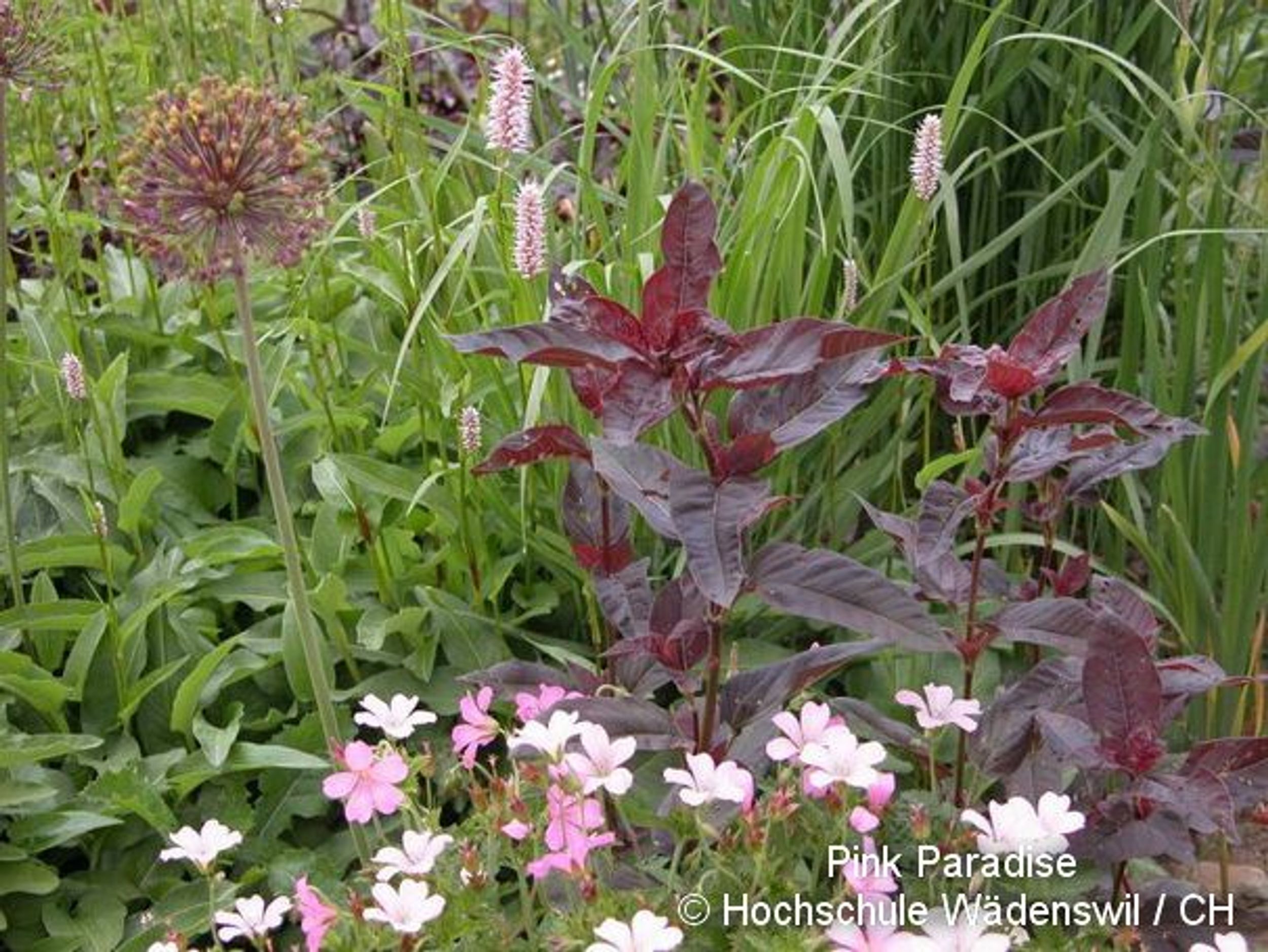 Pink Paradise – der Name ist Programm! Verschiedene Rosatöne verleihen dieser Mischung den Grundton. Rosa Blütenfarbtöne kontrastieren in der Pflanzung mit rotlaubigen Stauden.