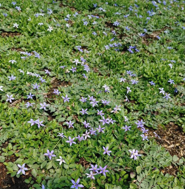 Pratia pedunculata ‚Dark Blue‘ Eine Neuerwerbung aus Neuseeland! Der „blaue Bubikopf“ blüht vom Frühjahrsende bis zum Herbst unermüdlich, verträgt volle Sonne wie auch leichten Schatten. Einziger Nachteil: unter strengen Kahlfrösten kann das Laub leiden, dann kann die Pflanze zurückgeschnitten werden und treibt wieder schön aus. Auch gut für Kübel und Tröge geeignet.