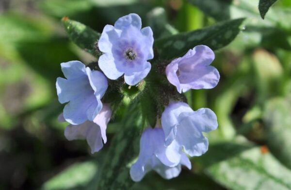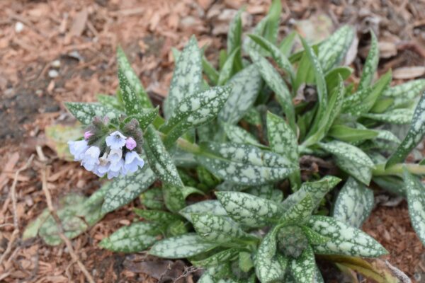 Pulmonaria saccharata ‚Opal‘ hat eher kleines Laub. Die Pflanze deckt aber den Boden dicht mit den dunkelgrünen, weiß gefleckten Blättern ab. Zartblau aufblühend verfärbt sich die Blüte gegen Ende der Blüte zu einem mittleren Blau und bietet damit ein interessantes Farbenspiel.