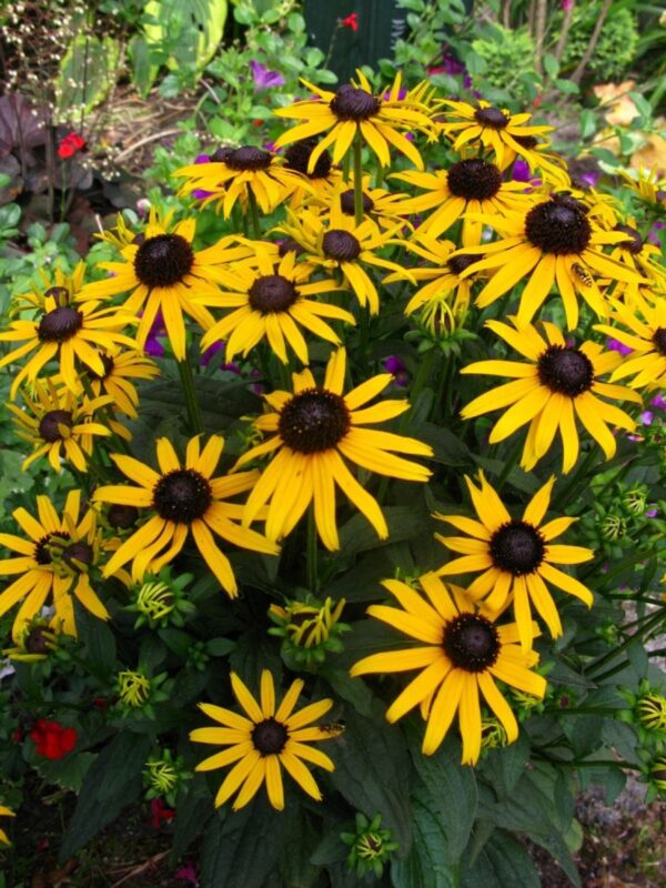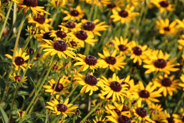Rudbeckia fulgida ‚Little Goldstar‘ ® der kleine Bruder des ‚Goldsturms‘. Diese Selektion hat alle positiven Eigenschaften dieser Sorte, bleibt aber nur halb so hoch und ist damit auch für kleinere Gärten eine sehr gute Bereicherung. Zahlreiche Blüten mit dem charakteristischen schwarzen Hut in der Mitte erscheinen ab Juli, die letzten Blüten verabschieden sich im Oktober. Das dunkelgrüne Laub unterstreicht noch die Leuchtkraft der Blüten.