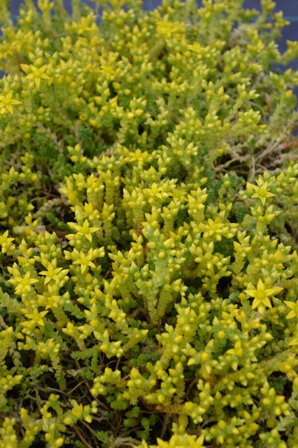 Sedum acre der scharfe Mauerpfeffer ist eine heimische Pflanze für heiße und trockene Stellen. Er breitet sich rasch aus, bedeckt mit seinen niedrigen, feinen Trieben schnell große Flächen. Feines, nadelartiges Laub, eine überreiche goldgelbe Blüte. Sollte die Pflanze einmal zu viel Wasser und Dünger bekommen können teilweise die Polster absterben – aber sie erholen sich mit einer großen Schnelligkeit und bedecken die Flächen wieder in kürzester Zeit.