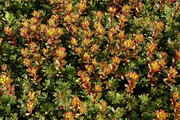 Sedum floriferum ‚Weihenstephaner Gold‘ – dieser Mauerpfeffer ist einer unserer Alleskönner! In der Dachbegrünung genauso zu Hause wie im Steingarten, als Bodendecker gut zu gebrauchen, ebenfalls im Balkonkasten. Die rötlichen Stiele tragen frischgrüne Blätter. Ein Teil des Laubes stirbt im Herbst ab, die Pflanze macht aber immer noch einen frischgrünen Eindruck – mit leichten roten Einsprengseln. Sehr schöne goldgelbe Blüte.