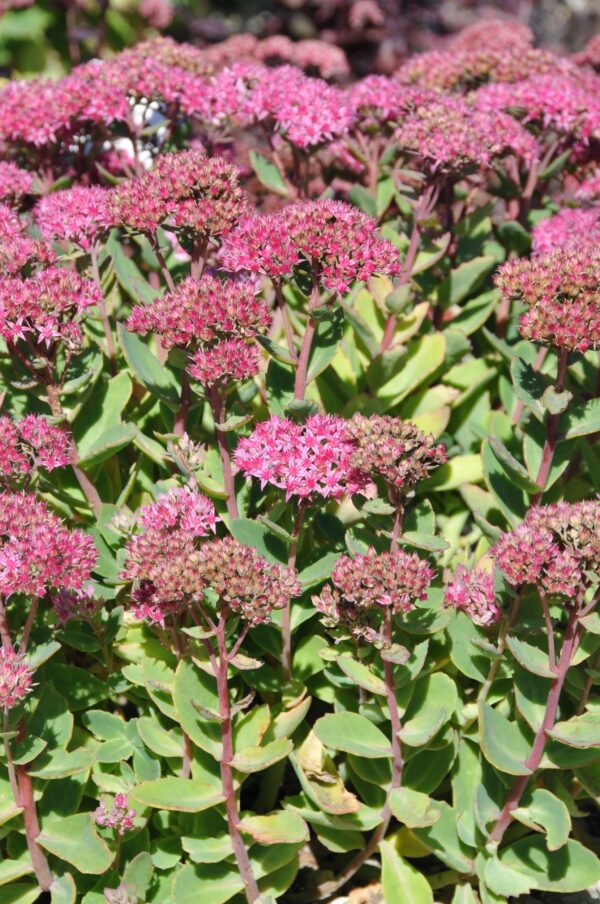 Sedum spectabile ‚Carl‘ blüht leuchtend kräftig rosarot auf rötlich gefärbten Stielen, die großen Blütenteller sitzen auf kräftigen Stielen. Kompakter, halbkugeliger Wuchs.