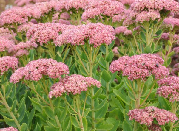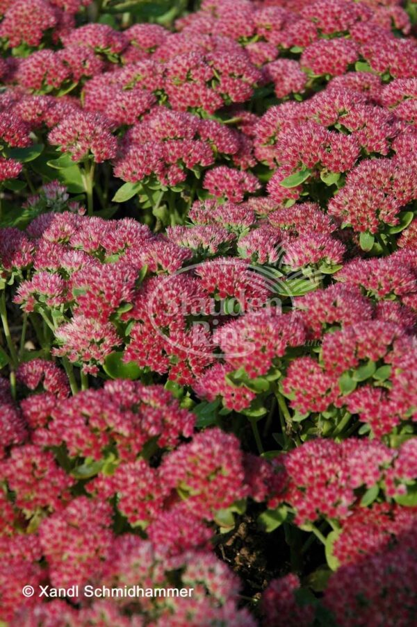 Sedum telephium ‚Herbstfreude‘ ist eine alte Sorte, die seit Jahrzehnten ihre sehr guten Eigenschaften ausspielt: standfest, graugrünes Laub, schöne dunkel-rosarote Blütenfarbe. Sehr stabile Stängel, die im Spätherbst eintrocknenden Blütenstängel sind den ganzen Winter über eine Zierde im Garten!