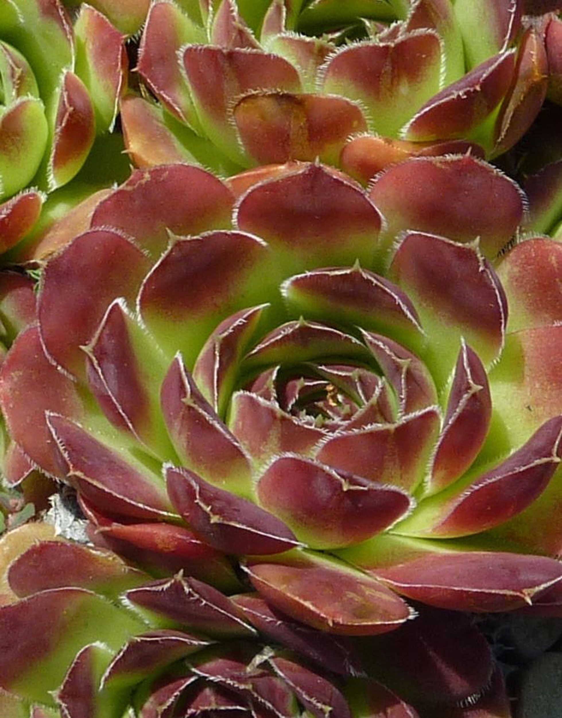 Sempervivum tectorum bildet ca 10-12 cm große Rosetten, grün mit roten Spitzen.
