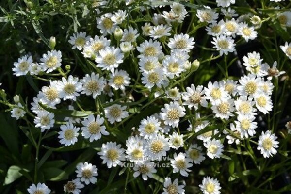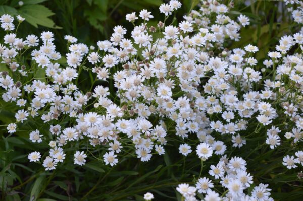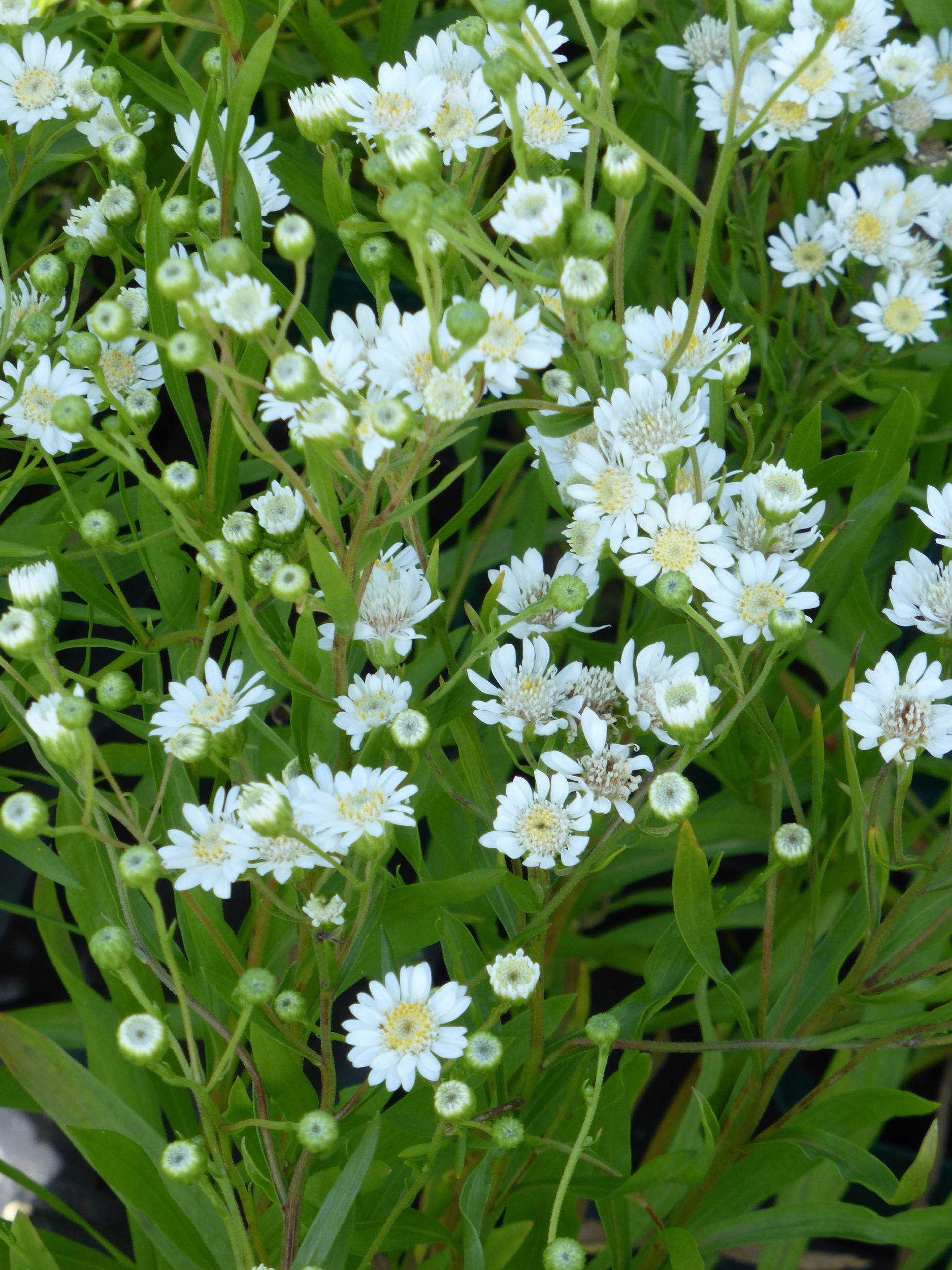 Solidago ptarmicoides ‚Major‘ hat wunderschöne weiße Korbblüten auf verzweigten Trieben. Lanzettliches Laub. Horstiger Wuchs und rötlicher Herbstfärbung. Besonders schöner, gleichmäßiger Wuchs