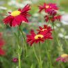 Tanacetum coccineum ‚Robinson Rot‘ hat kräftig gefärbte rote margeritenförmige Blüten.