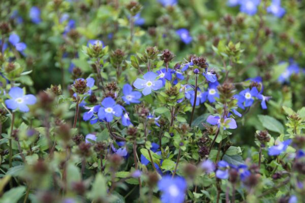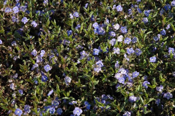 Veronica peduncularis ‚Georgia Blue‘ ist eine hübsche niedrigwachsende Form. Das dunkle Laub steht sehr schön kontrastreich zu den kräftig blauen Blüten. Für kleinere Flächen als Bodendecker gut einzusetzen, ebenso im Steingarten gut geeignet. Verträgt volle Sonne und bevorzugt trockene Böden.