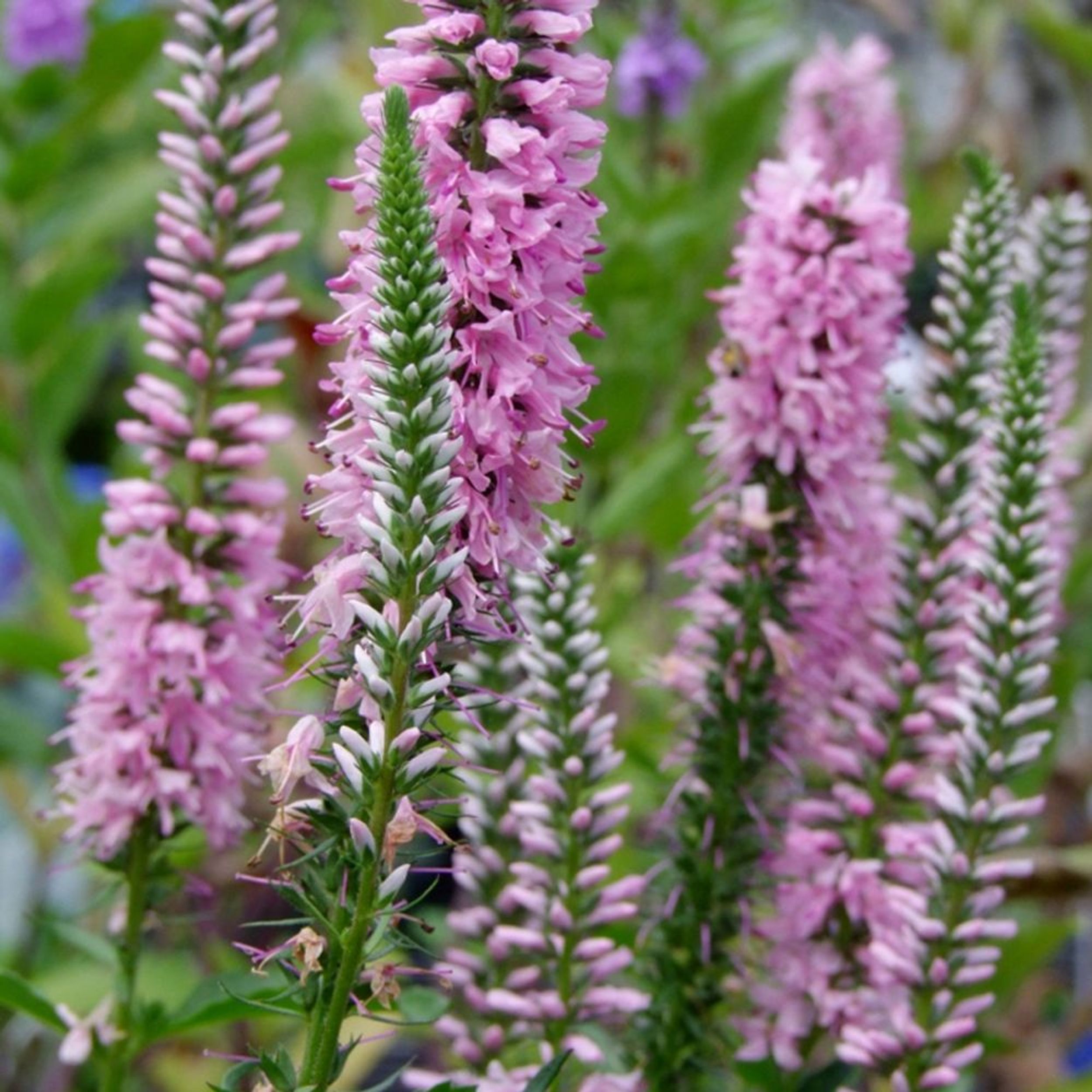 Veronicastrum virginicum ‚Pink Glow‘ Diese Pflanzen sind eng mit Veronica verwandt, unterscheiden sich aber durch einen stabilen, kantigen Stängel der an den Knoten rundum mit schmalen, lanzettlichen Blättern besetzt ist – schon ohne Blüten eine markante Erscheinung. Die Blütenkerzen sind zahlreich und reich verzweigt, nach der Blüte kann diese über dem Laub abgeschnitten werden, dann erfolgt noch eine Nachblüte. Alle Gartenböden sind geeignet, nicht zu trocken, sonniger bis absonniger Standort.